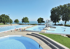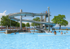 Modernes Schwimmbad, direkt am See, mit Riesenrutschbahn und 10-m-Sprungturm, Kleinkinderbecken, Nichtschwimmer- und Schwimmerbecken, Grillplatz und Selbstbedienungsrestaurant.