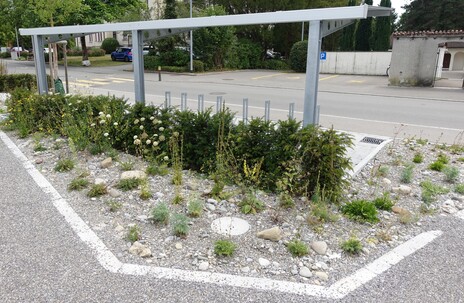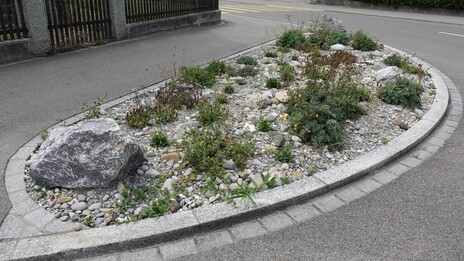 In einem ersten Schritt waren Freiflächen auf Arboner Stadtgebiet erfasst und geeignete Aufwertungsmassnahmen für diese festgelegt worden. Zu den im laufenden Jahr umgestalteten Flächen gehören auch einige bei der Verzweigung Landquartstrasse-Schöntalstrasse, etwa die unten abgebildete. Hier wurde die vorherige Bepflanzung ersetzt durch eine einheimische, und es wurden nicht nur Pflanzen gesetzt, sondern auch angesät. An anderer Stelle wurde eine Wiese anstelle einer Rasenfläche angelegt. Auch neu geschaffene Flächen werden möglichst naturnah gestaltet, so beispielsweise beim Veloabstellplatz beim Friedhof. Im Frühling 2022 wurde hier eine einheimische Eibenhecke gepflanzt, und auch die weiteren Wildstauden sind alle einheimisch.