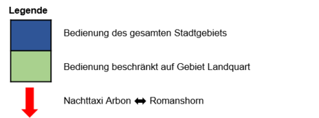 An den Wochenenden wird ein Nachttaxi-Service zwischen Arbon und Romanshorn angeboten. Das Nachttaxi transportiert Sie für CHF 20 vom Romanshorner Bahnhof zu Ihrem Wohnort in Arbon und umgekehrt.